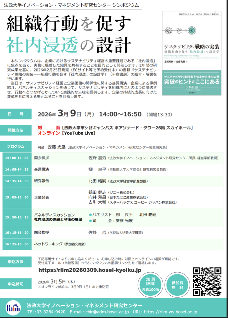 本シンポジウムは、企業におけるサステナビリティ経営の重要課題である「社内浸透」に焦点を当て、実務に根ざした知見を共有することを目的として開催します。2年間の研究成果を基に、2026年2月25日発売(ECサイト等で予約受付中)の書籍『サステナビリティ戦略の実装 ―組織行動を促す「社内浸透」の設計学―』(千倉書房)の紹介・解説を行います。