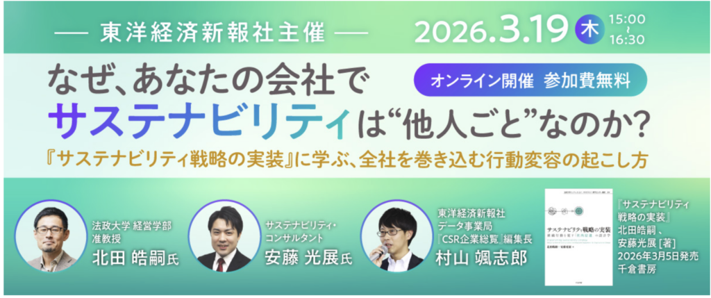 先日,出版された『サステナビリティ戦略の実装: 組織行動を促す「社内浸透」の設計学』に関して,東洋経済新報社主催でシンポジウムを開催いただきました。出版社の垣根を越えて,日本企業の抱える「社内浸透」という課題をイベントのテーマに取り上げていただいた尾登様,村山様にはとても感謝しております。350名ほどの登録があり,改めて関心の高いテーマであることを確信しました。会員の方は後日,アーカイブも視聴できるとのことですので,もし良ければご覧ください。